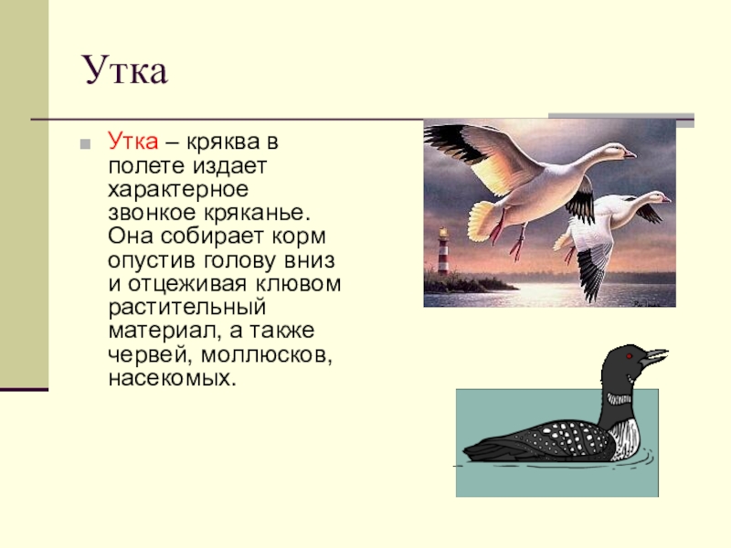 УткаУтка – кряква в полете издает характерное звонкое кряканье. Она собирает корм опустив голову вниз и отцеживая