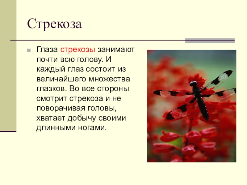 величайшего множества глазков. Во все стороны смотрит стрекоза и не поворачивая головы, хватает добычу своими длинными ногами.