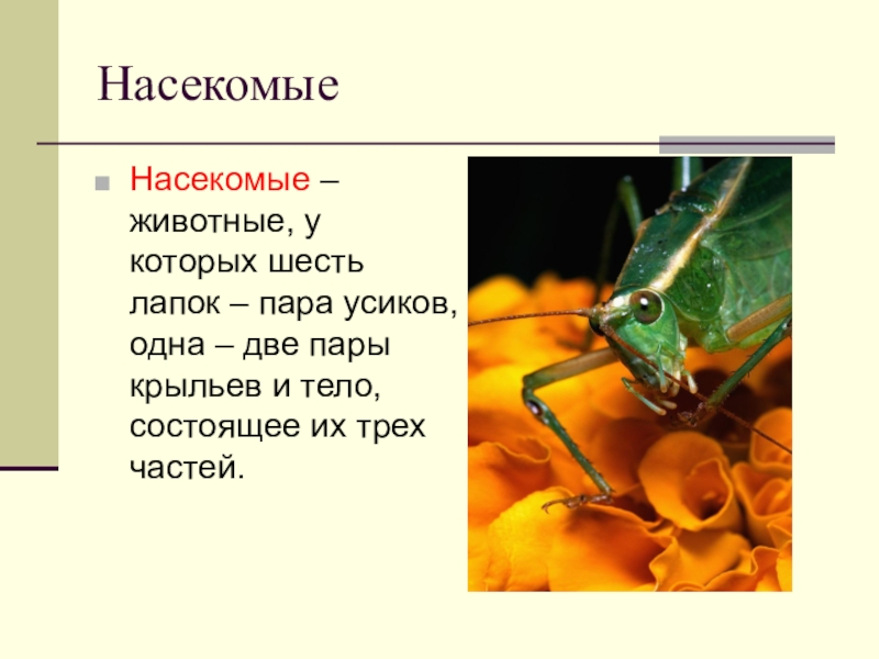 НасекомыеНасекомые – животные, у которых шесть лапок – пара усиков, одна – две пары крыльев и тело,