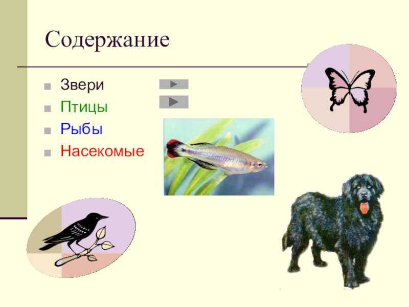 СодержаниеЗвериПтицыРыбыНасекомые
