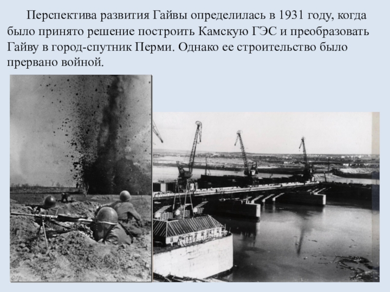построить Камскую ГЭС и преобразовать Гайву в город-спутник Перми. Однако ее строительство было прервано войной.