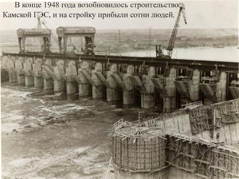 Слайд 12 В конце 1948 года возобновилось строительство Камской ГЭС, и на стройку