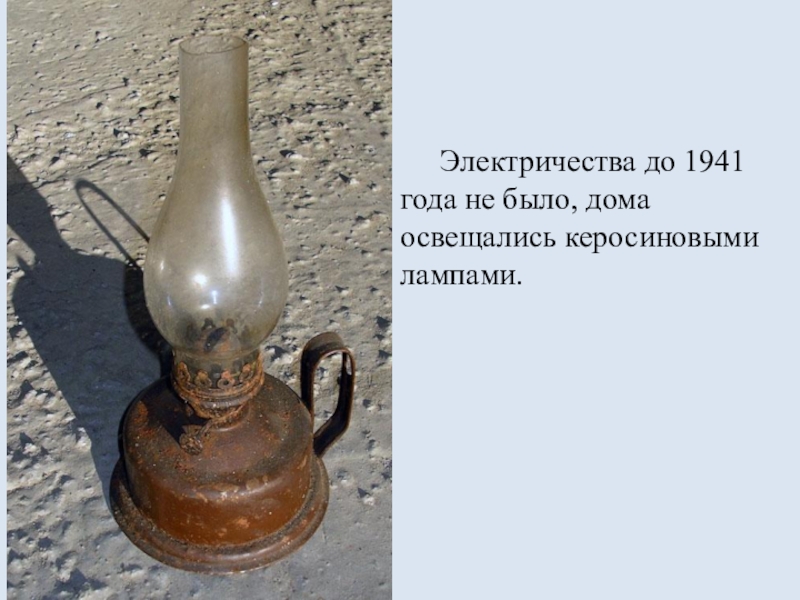 Слайд 9 Электричества до 1941 года не было, дома освещались керосиновыми лампами.