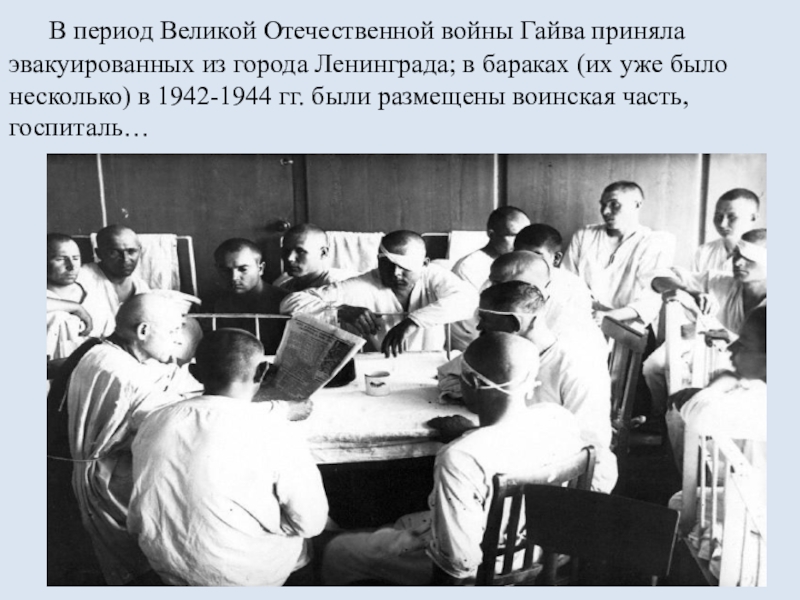 Слайд 11 В период Великой Отечественной войны Гайва приняла эвакуированных из города Ленинграда;