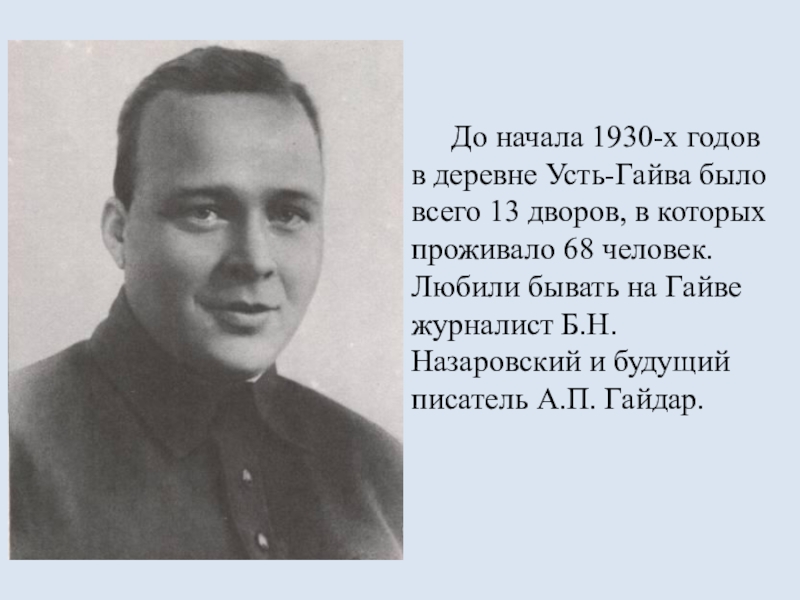 в которых проживало 68 человек. Любили бывать на Гайве журналист Б.Н. Назаровский и будущий писатель А.П. Гайдар.