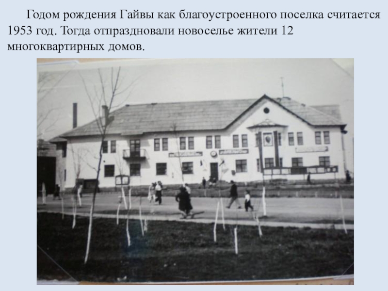 Слайд 14 Годом рождения Гайвы как благоустроенного поселка считается 1953 год. Тогда отпраздновали