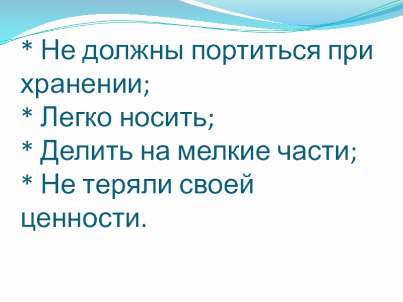 Слайд 8* Не должны портиться при хранении; * Легко носить; * Делить на мелкие