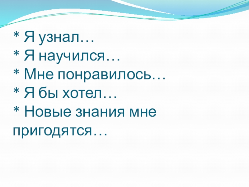 * Я узнал… * Я научился… * Мне понравилось… * Я бы хотел… * Новые знания мне