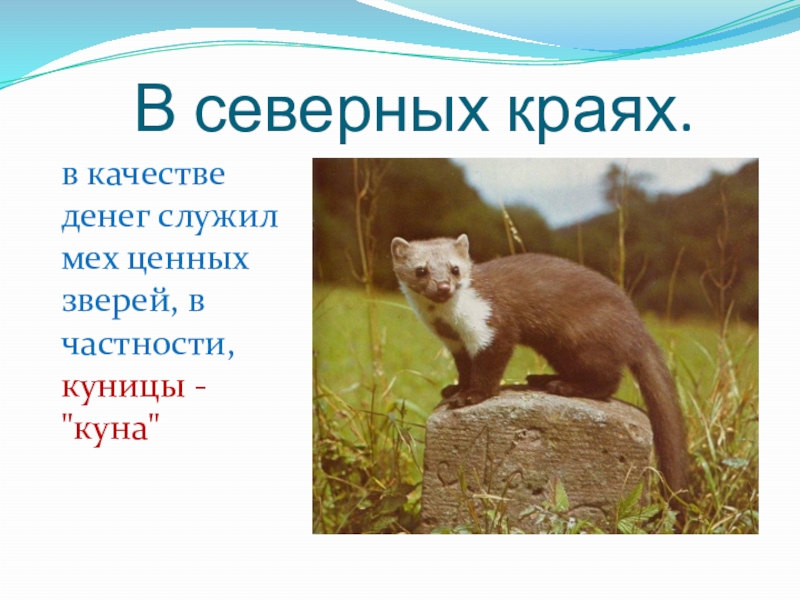 В северных краях.в качестве денег служил мех ценных зверей, в частности, куницы -