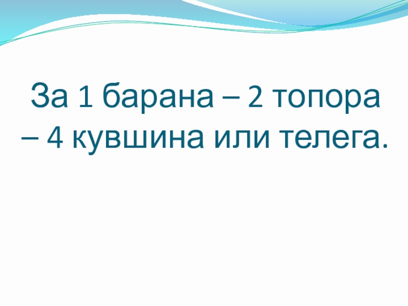 Слайд 5За 1 барана – 2 топора – 4 кувшина или телега.