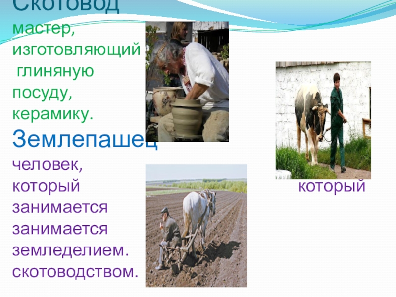 Скотовод мастер, изготовляющий глиняную посуду, керамику. Землепашец человек, человек, который который занимается занимается земледелием. скотоводством.