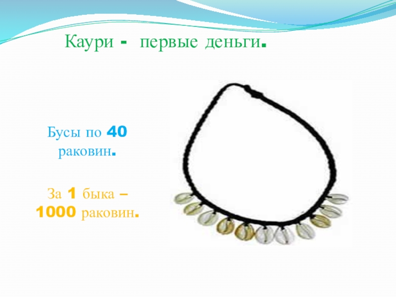 Каури - первые деньги.   Бусы по 40 раковин.За 1 быка – 1000