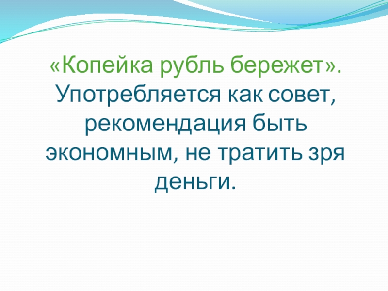 Слайд 19«Копейка рубль бережет». Употребляется как совет, рекомендация быть экономным, не тратить