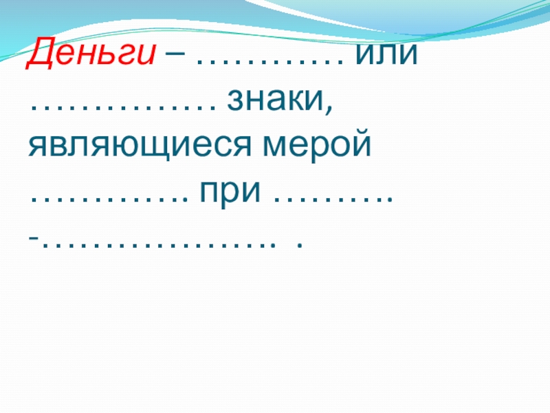 Слайд 26Деньги – ………… или …………… знаки, являющиеся мерой …………. при ……….