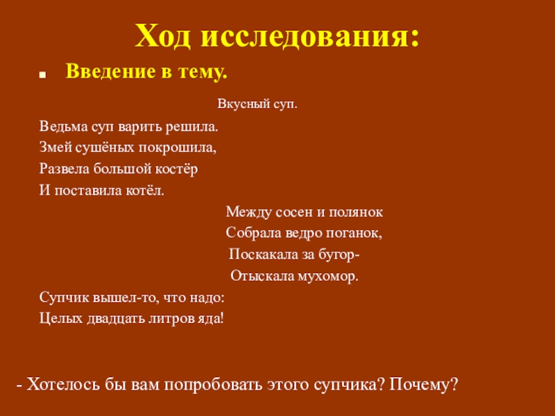- Хотелось бы вам попробовать этого супчика? Почему?
