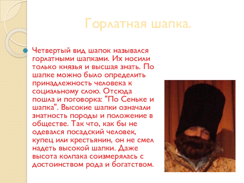 и высшая знать. По шапке можно было определить принадлежность человека к социальному слою. Отсюда пошла и поговорка: "По Сеньке и шапка". Высокие шапки означали знатность породы и положение в обществе. Так что, как бы не одевался посадский человек, купец или крестьянин, он не смел надеть высокой шапки. Даже высота колпака соизмерялась с достоинством рода и богатством.