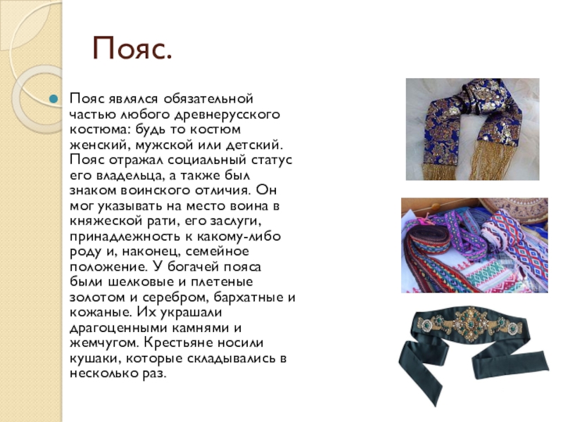 мужской или детский. Пояс отражал социальный статус его владельца, а также был знаком воинского отличия. Он мог указывать на место воина в княжеской рати, его заслуги, принадлежность к какому-либо роду и, наконец, семейное положение. У богачей пояса были шелковые и плетеные золотом и серебром, бархатные и кожаные. Их украшали драгоценными камнями и жемчугом. Крестьяне носили кушаки, которые складывались в несколько раз.