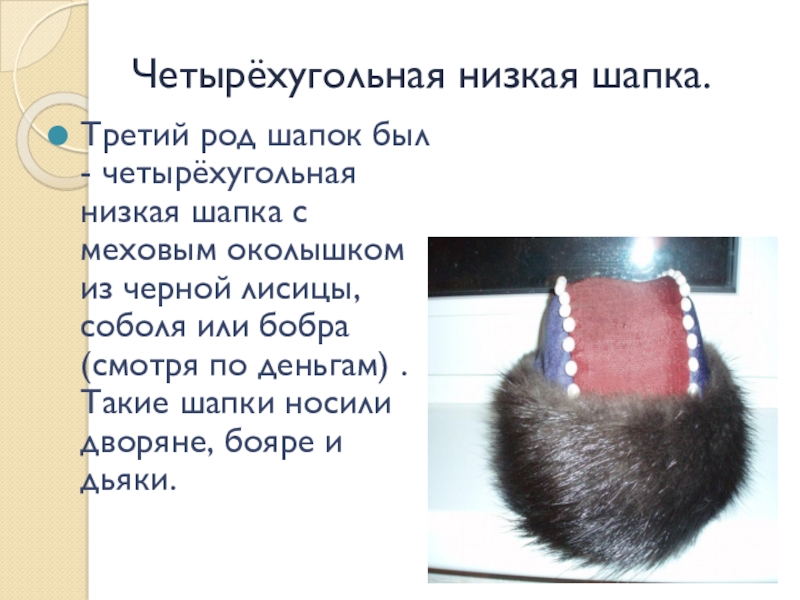 меховым околышком из черной лисицы, соболя или бобра (смотря по деньгам) . Такие шапки носили дворяне, бояре и дьяки.
