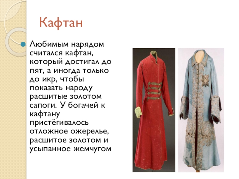 до икр, чтобы показать народу расшитые золотом сапоги. У богачей к кафтану пристёгивалось отложное ожерелье, расшитое золотом и усыпанное жемчугом