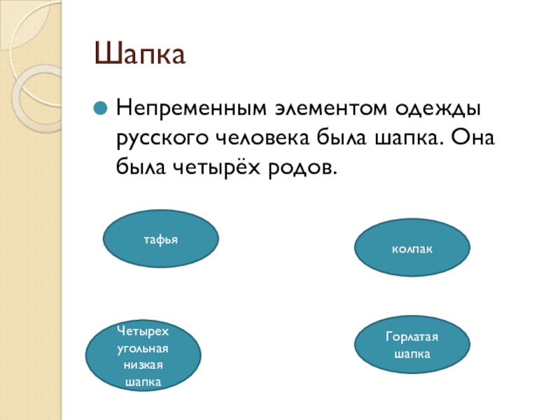 Непременным элементом одежды русского человека была шапка. Она была четырёх родов.