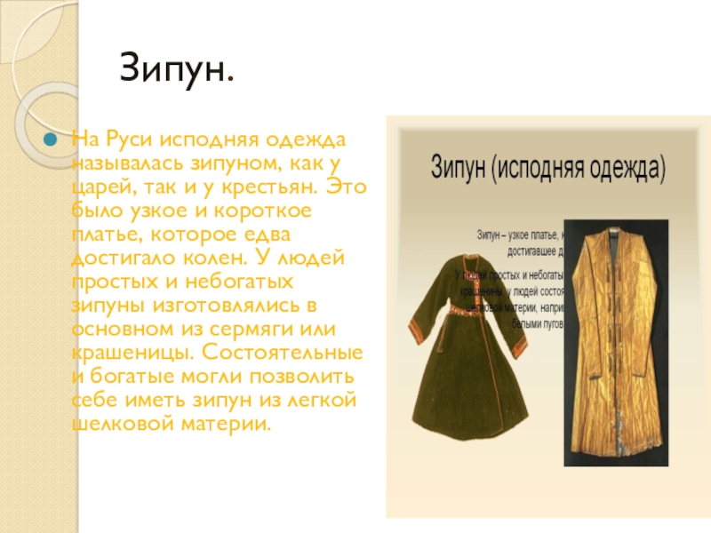 у крестьян. Это было узкое и короткое платье, которое едва достигало колен. У людей простых и небогатых зипуны изготовлялись в основном из сермяги или крашеницы. Состоятельные и богатые могли позволить себе иметь зипун из легкой шелковой материи.
