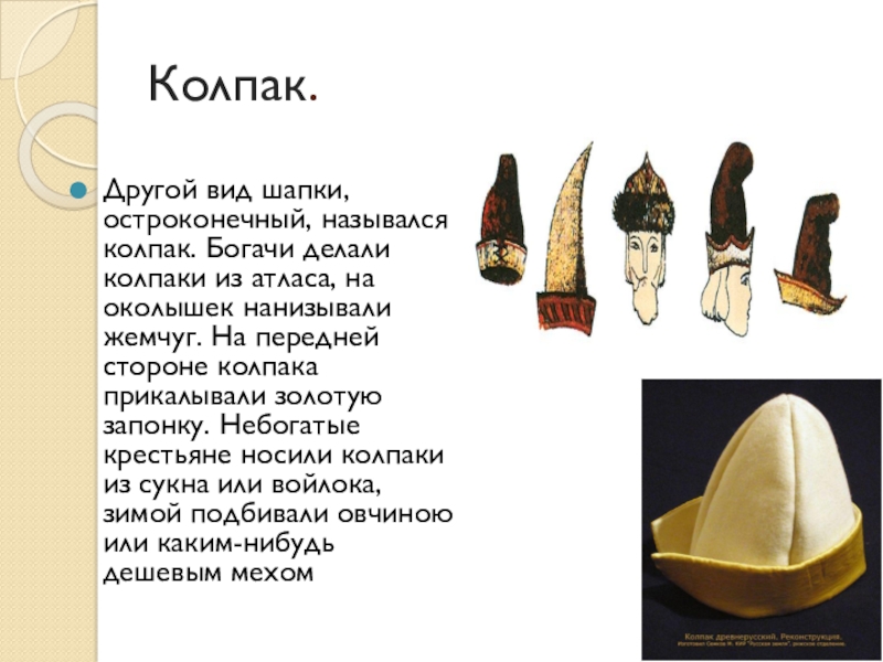Другой вид шапки, остроконечный, назывался колпак. Богачи делали колпаки из атласа,