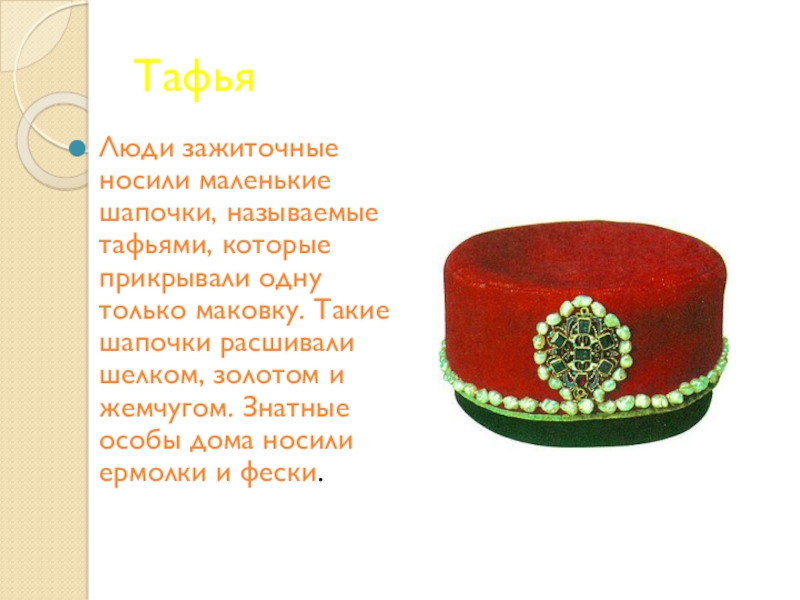 Люди зажиточные носили маленькие шапочки, называемые тафьями, которые прикрывали одну только