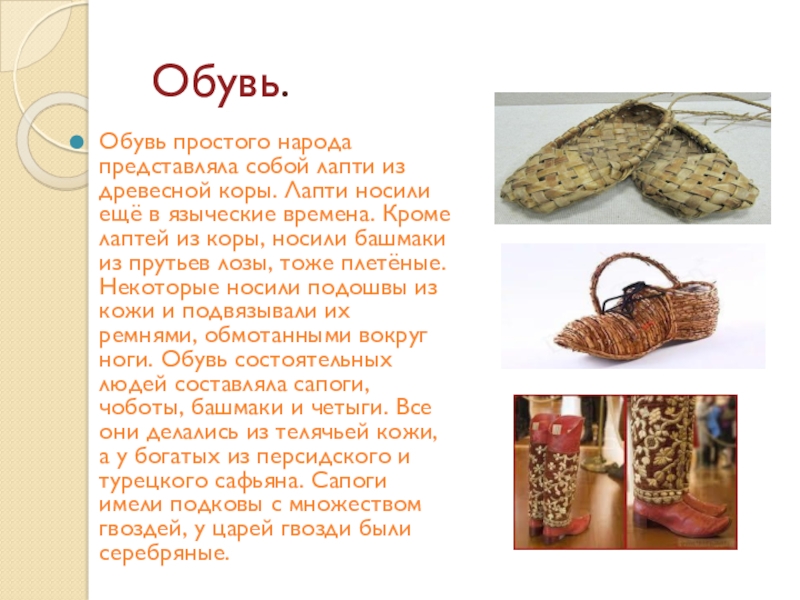 ещё в языческие времена. Кроме лаптей из коры, носили башмаки из прутьев лозы, тоже плетёные. Некоторые носили подошвы из кожи и подвязывали их ремнями, обмотанными вокруг ноги. Обувь состоятельных людей составляла сапоги, чоботы, башмаки и четыги. Все они делались из телячьей кожи, а у богатых из персидского и турецкого сафьяна. Сапоги имели подковы с множеством гвоздей, у царей гвозди были серебряные.