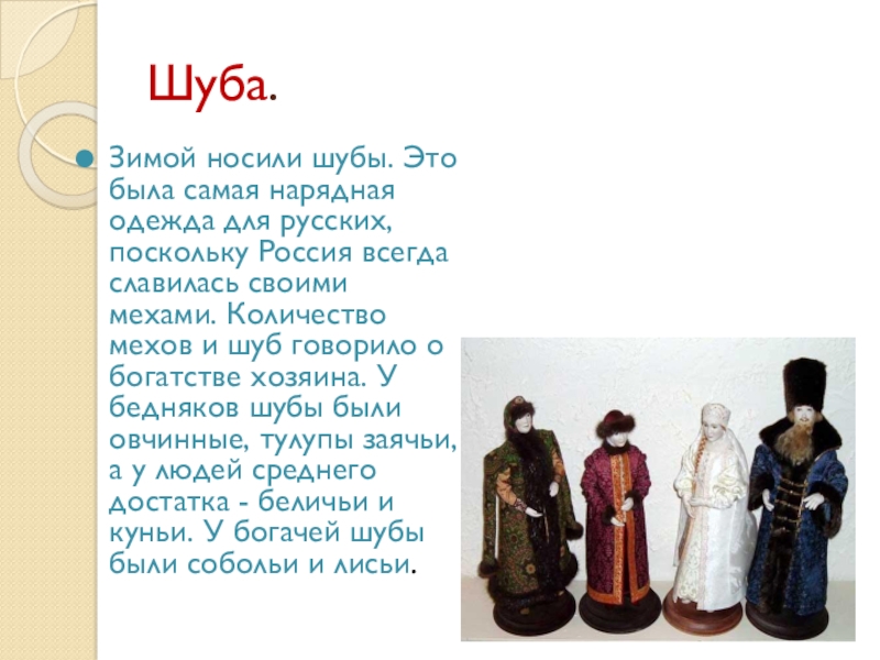 Зимой носили шубы. Это была самая нарядная одежда для русских, поскольку