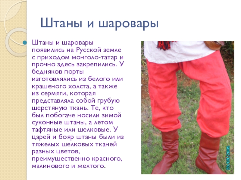 монголо-татар и прочно здесь закрепились. У бедняков порты изготовлялись из белого или крашеного холста, а также из сермяги, которая представляла собой грубую шерстяную ткань. Те, кто был побогаче носили зимой суконные штаны, а летом тафтяные или шелковые. У царей и бояр штаны были из тяжелых шелковых тканей разных цветов, преимущественно красного, малинового и желтого.