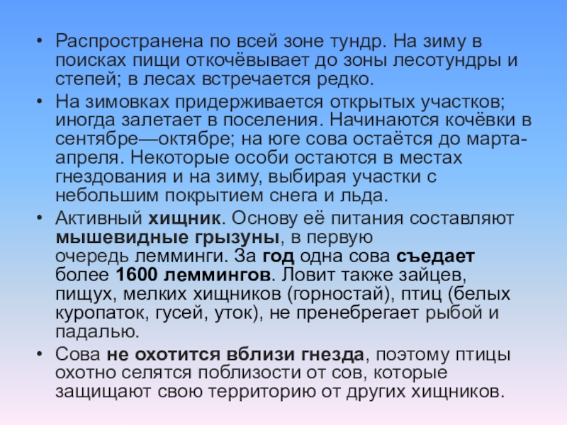 Слайд 6Распространена по всей зоне тундр. На зиму в поисках пищи откочёвывает