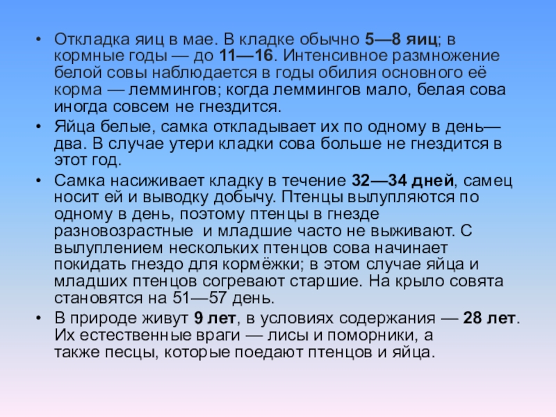 годы — до 11—16. Интенсивное размножение белой совы наблюдается в годы обилия основного её корма — леммингов; когда леммингов мало, белая сова иногда совсем не гнездится.