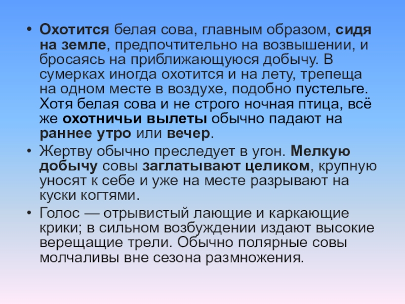 Слайд 8Охотится белая сова, главным образом, сидя на земле, предпочтительно на возвышении,