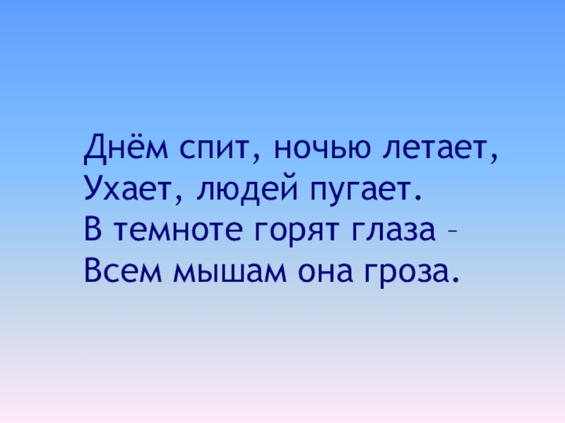 Днём спит, ночью летает, Ухает, людей пугает. В темноте горят глаза – Всем мышам она гроза.