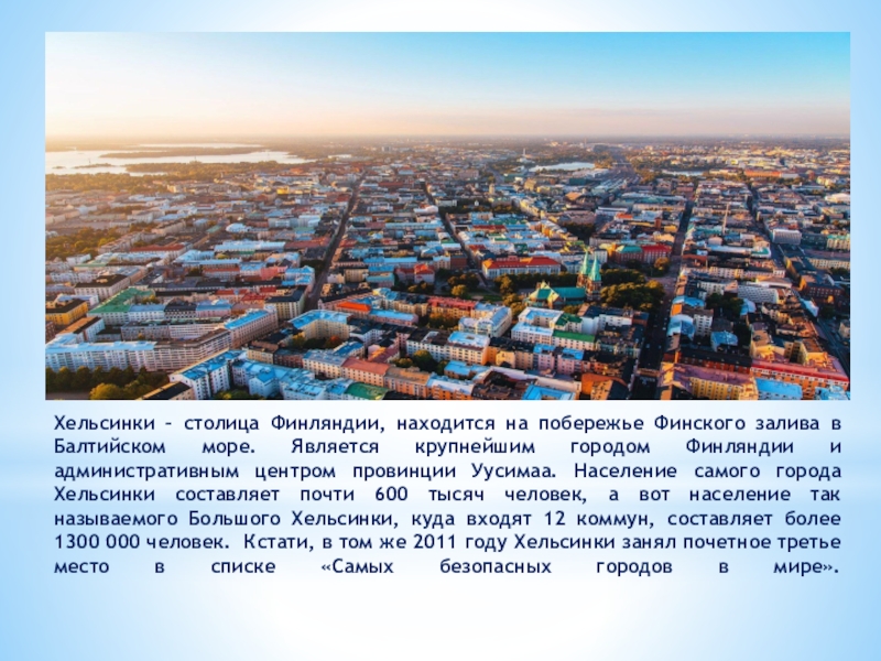 море. Является крупнейшим городом Финляндии и административным центром провинции Уусимаа. Население самого города Хельсинки составляет почти 600 тысяч человек, а вот население так называемого Большого Хельсинки, куда входят 12 коммун, составляет более 1300 000 человек. Кстати, в том же 2011 году Хельсинки занял почетное третье место в списке «Самых безопасных городов в мире».