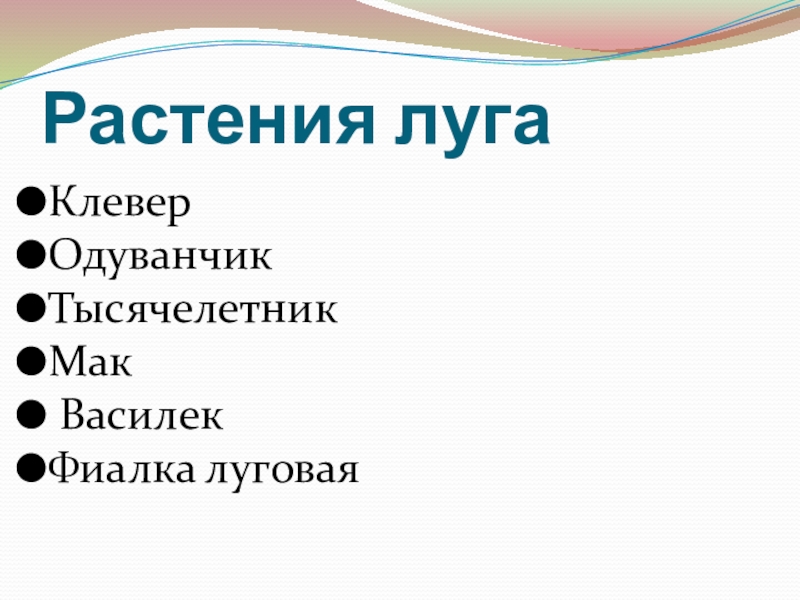 Растения лугаКлеверОдуванчикТысячелетникМак ВасилекФиалка луговая