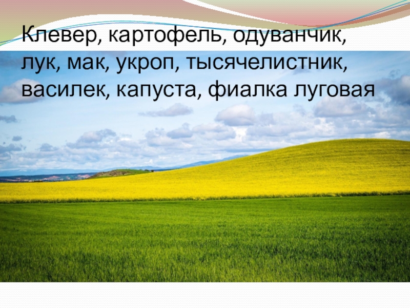 Клевер, картофель, одуванчик,лук, мак, укроп, тысячелистник, василек, капуста, фиалка луговая