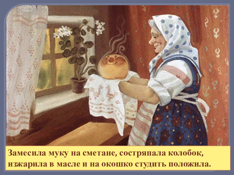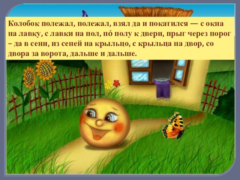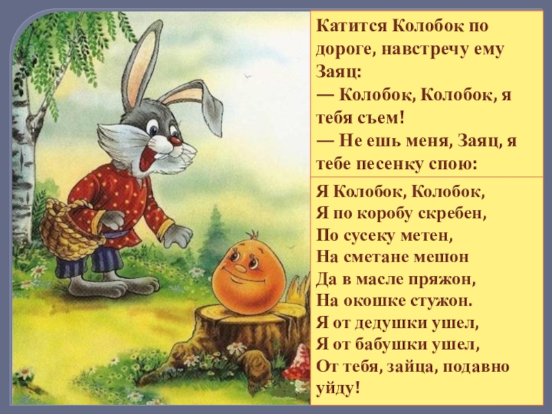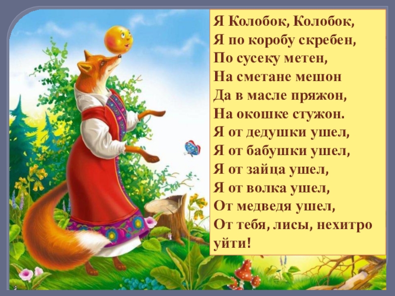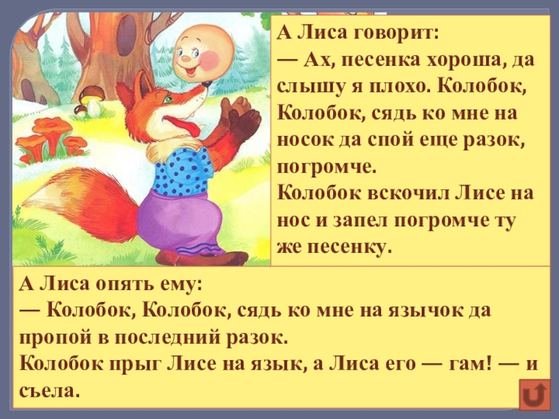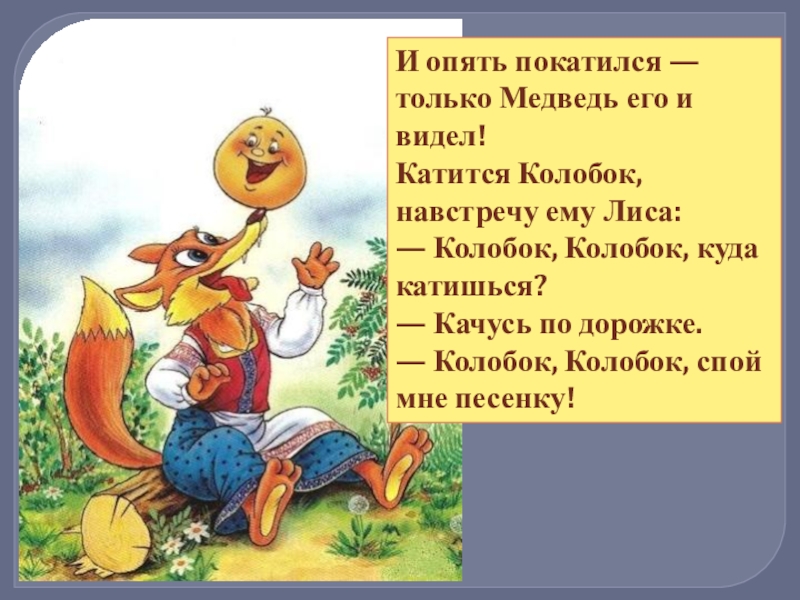 Колобок прыг Лисе на язык, а Лиса его — гам! — и съела.