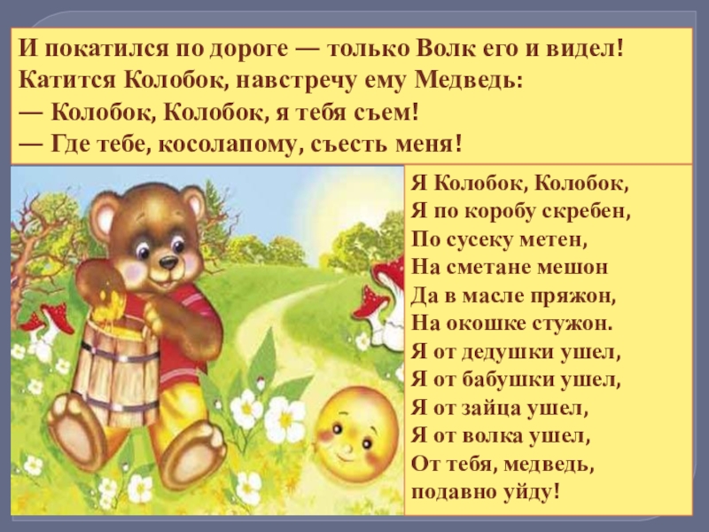 — Колобок, Колобок, сядь ко мне на язычок да пропой в последний разок.