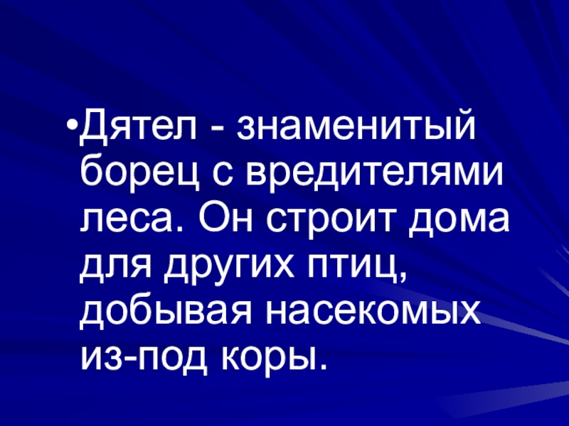 Слайд 6Дятел - знаменитый борец с вредителями леса. Он строит дома для