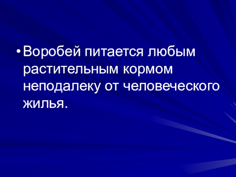 Слайд 4Воробей питается любым растительным кормом неподалеку от человеческого жилья.