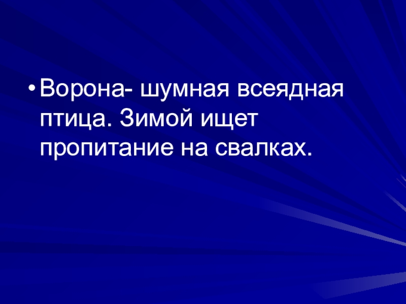 Слайд 8Ворона- шумная всеядная птица. Зимой ищет пропитание на свалках.