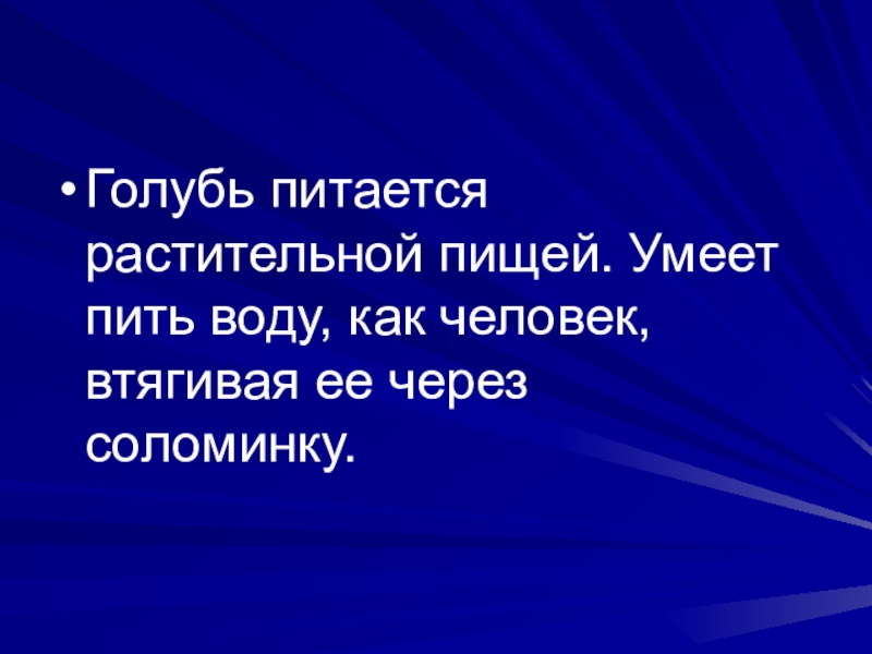 Слайд 12Голубь питается растительной пищей. Умеет пить воду, как человек, втягивая ее