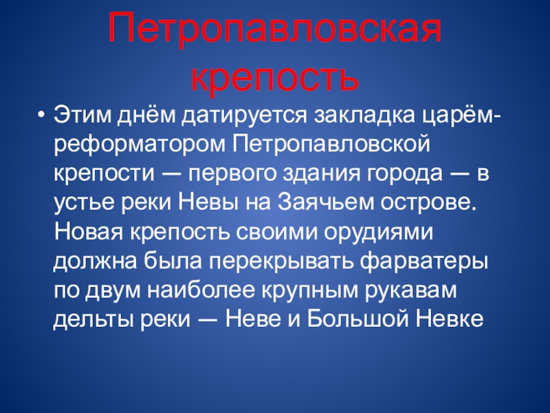 здания города — в устье реки Невы на Заячьем острове. Новая крепость своими орудиями должна была перекрывать фарватеры по двум наиболее крупным рукавам дельты реки — Неве и Большой Невке