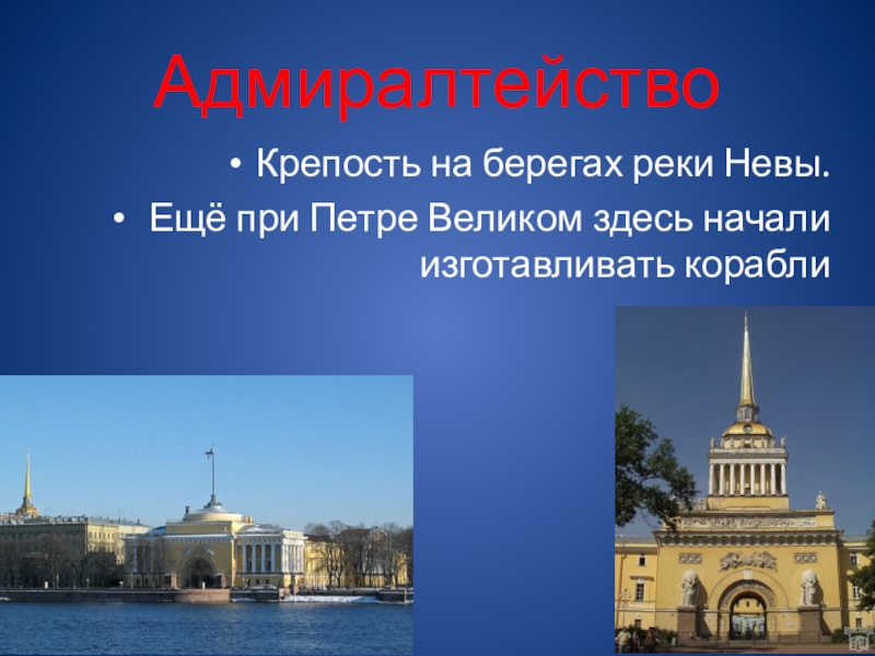 АдмиралтействоКрепость на берегах реки Невы. Ещё при Петре Великом здесь начали изготавливать корабли