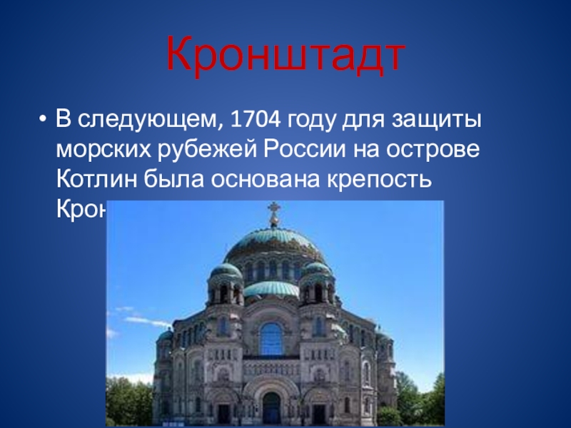 КронштадтВ следующем, 1704 году для защиты морских рубежей России на острове Котлин была основана крепость Кронштадт