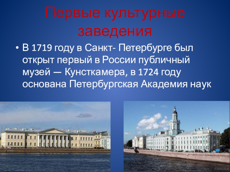 Первые культурные заведенияВ 1719 году в Санкт- Петербурге был открыт первый в России публичный музей — Кунсткамера,