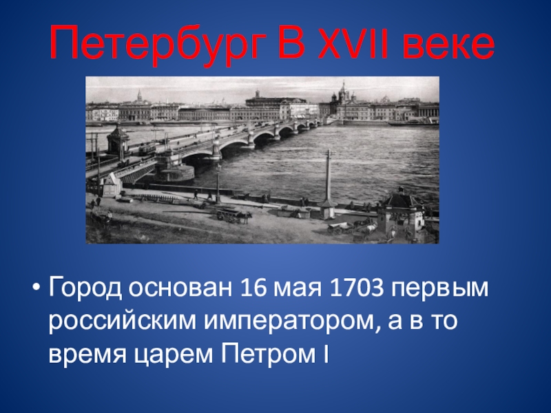 Петербург В XVII векеГород основан 16 мая 1703 первым российским императором, а в то время царем Петром I