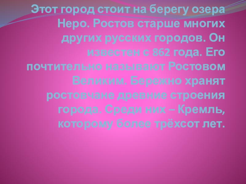 русских городов. Он известен с 862 года. Его почтительно называют Ростовом Великим. Бережно хранят ростовчане древние строения города. Среди них – Кремль, которому более трёхсот лет.