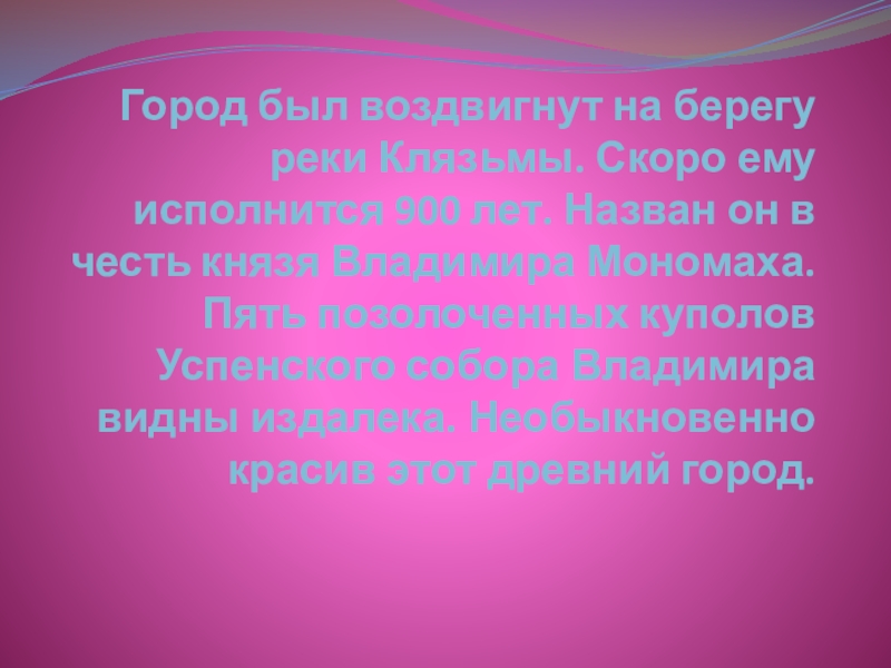 Слайд 16Город был воздвигнут на берегу реки Клязьмы. Скоро ему исполнится 900